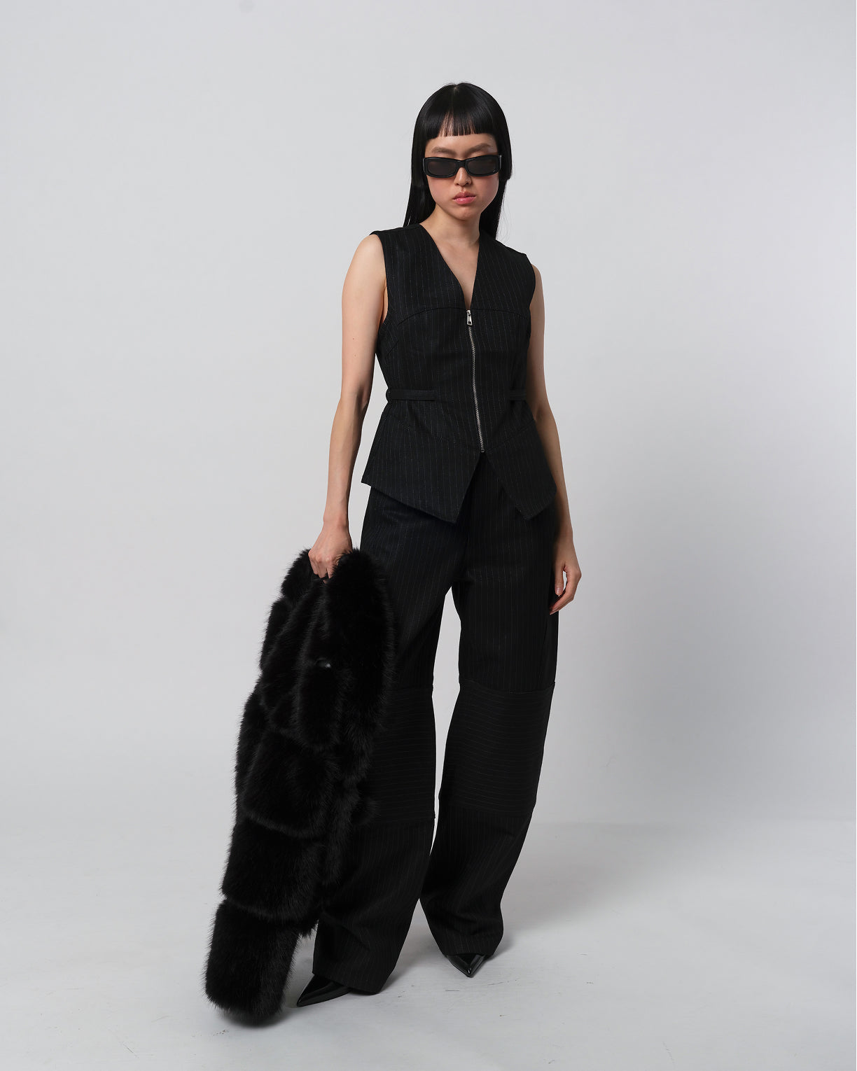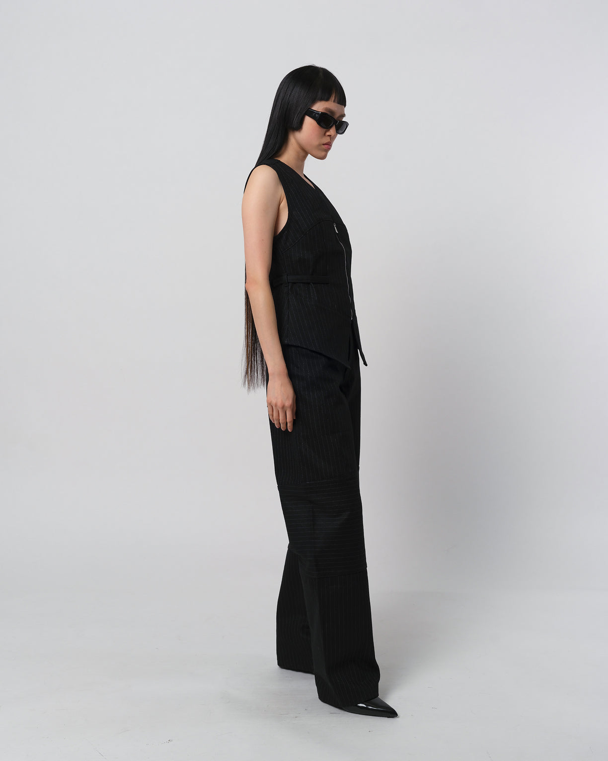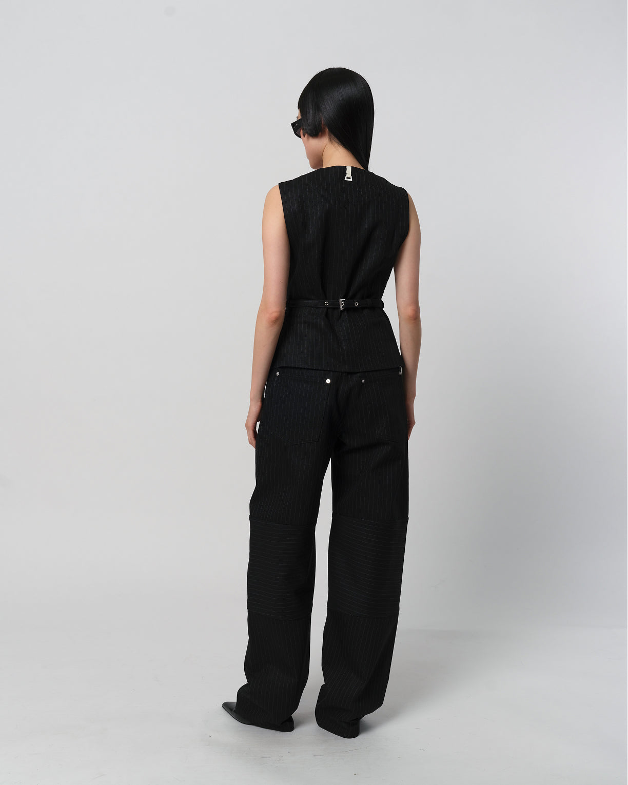 Pinstripe denim vest.