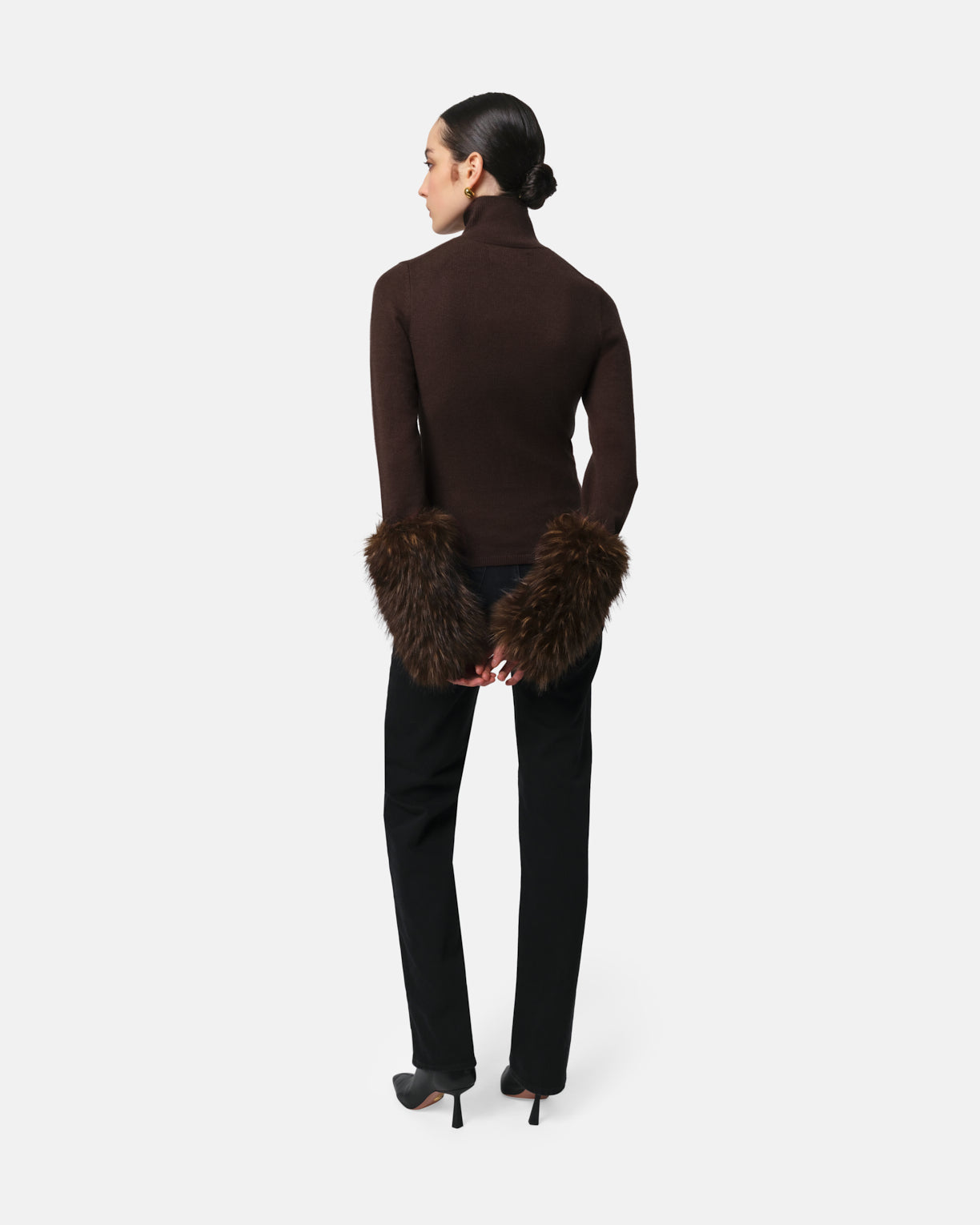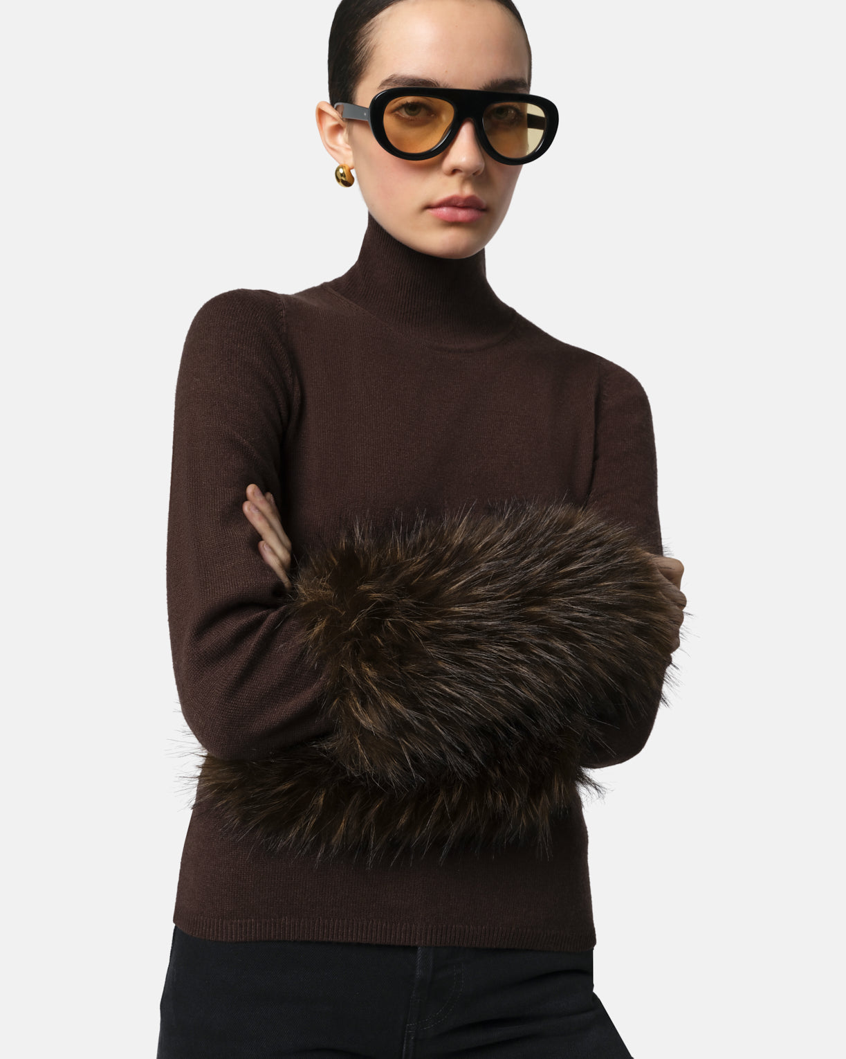 DOUX knit funnel neck with recycled tipped fox faux fur cuffs.