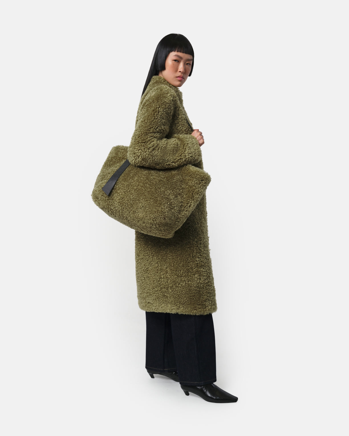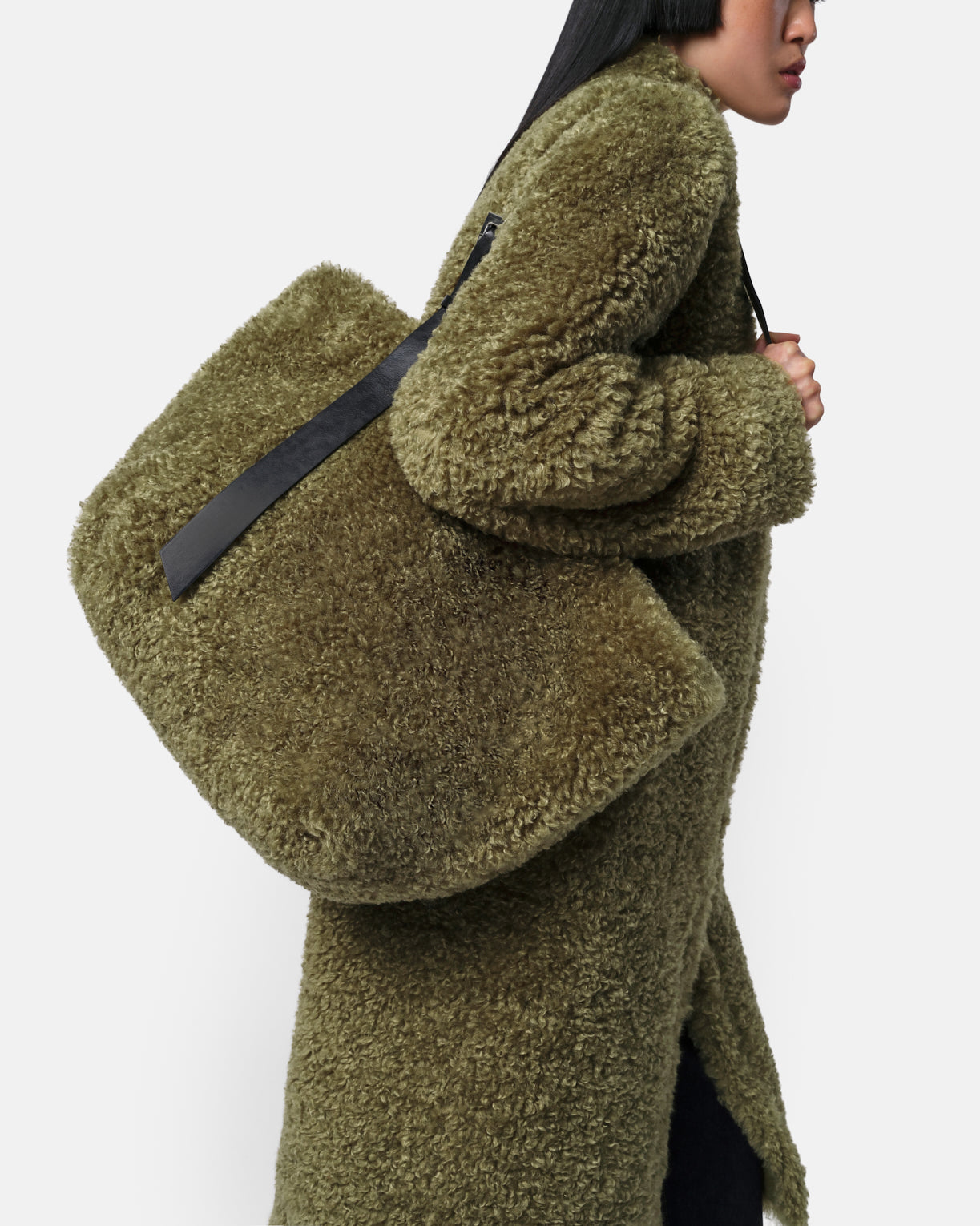 Ultra-soft BOUCLETTE faux shearling with bonded faux suede lining and Sans leather strap.