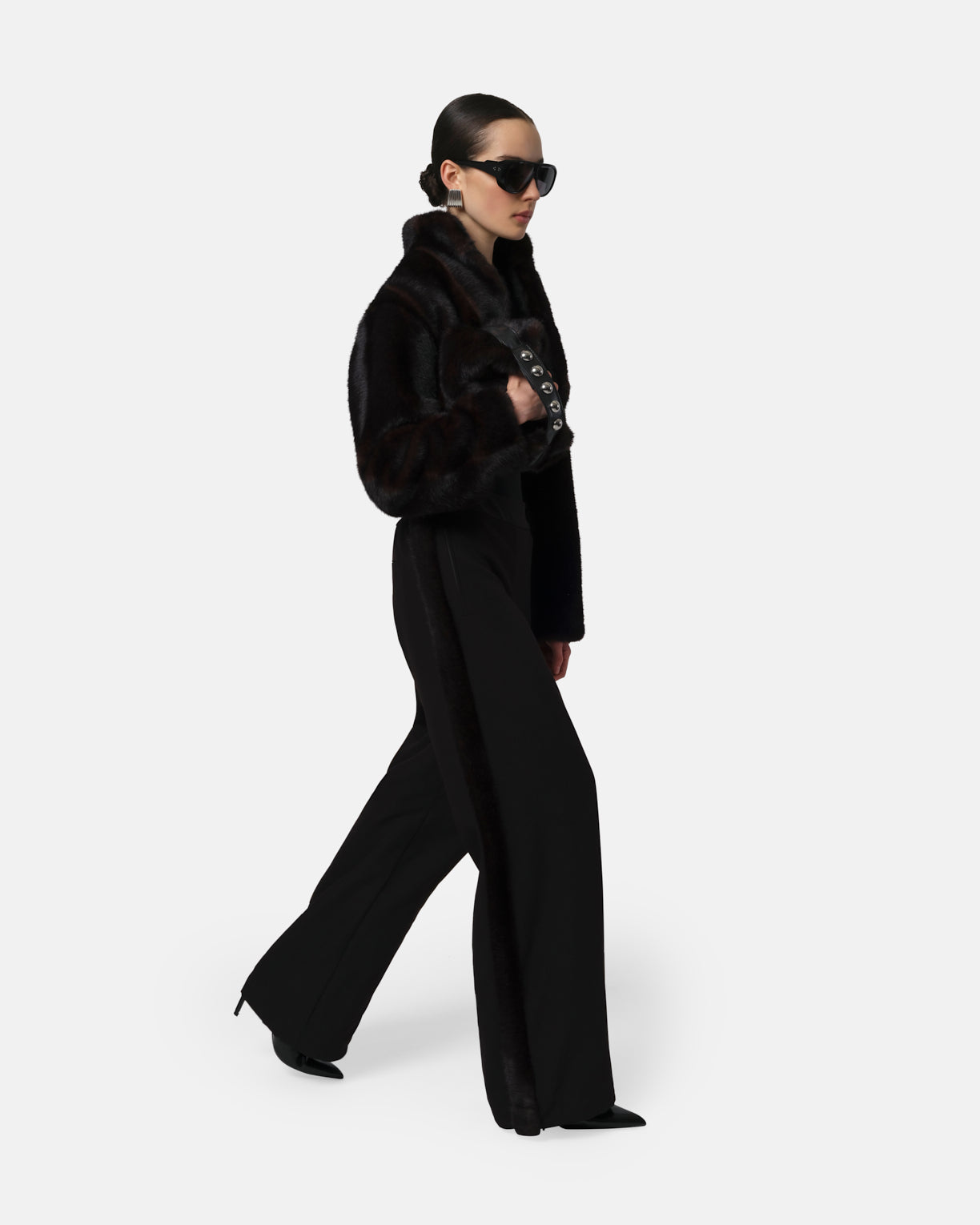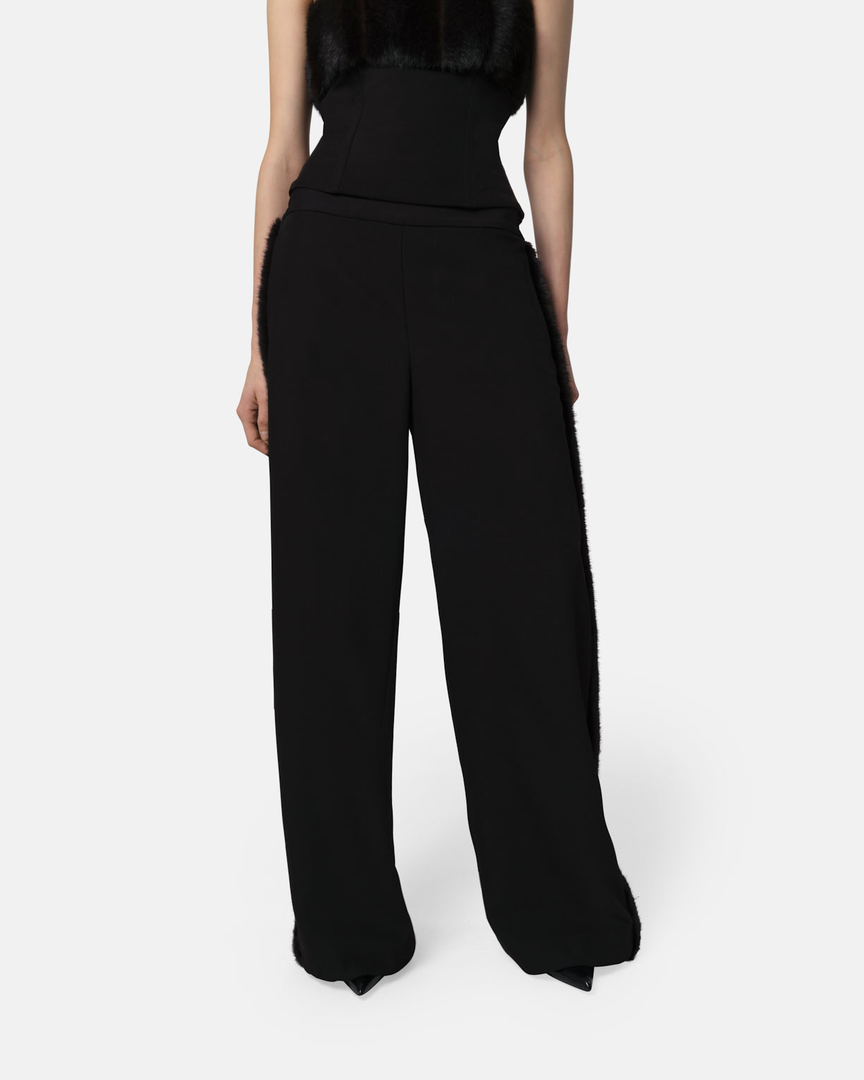 Mid rise stretch crepe pants with shaved mink faux fur stripe.