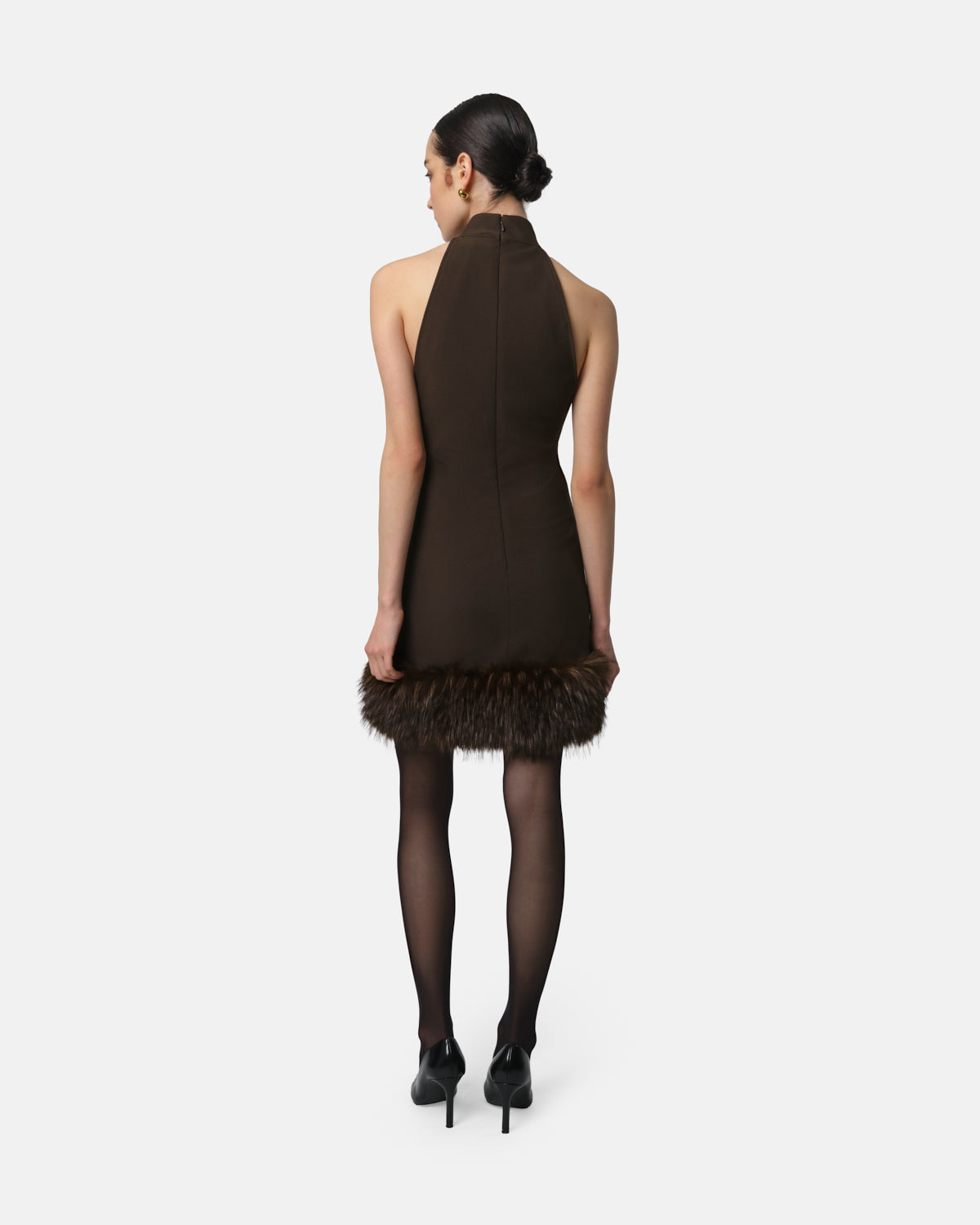Stretch crepe mini dress with tipped fox faux fur trim.