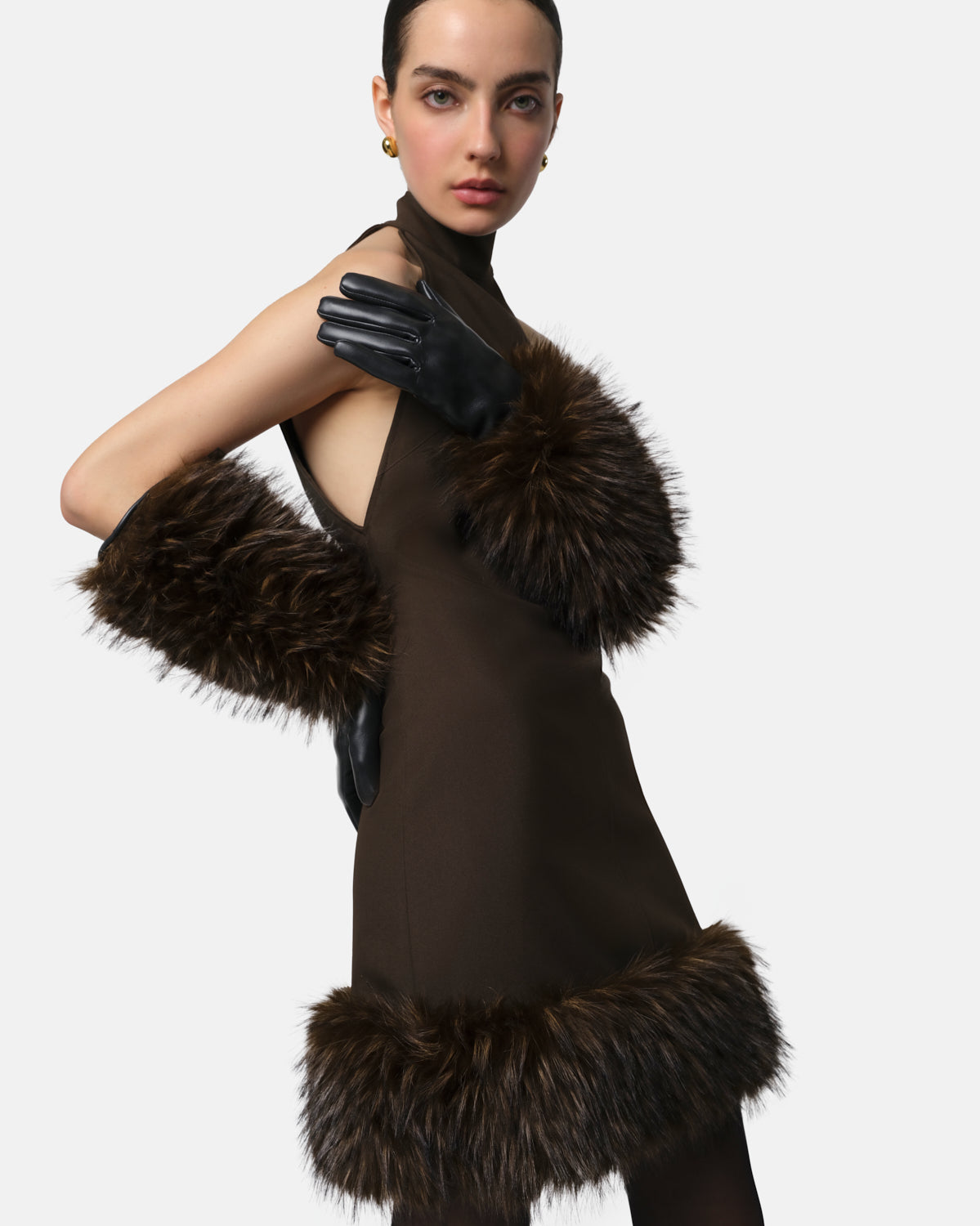Stretch crepe mini dress with tipped fox faux fur trim.