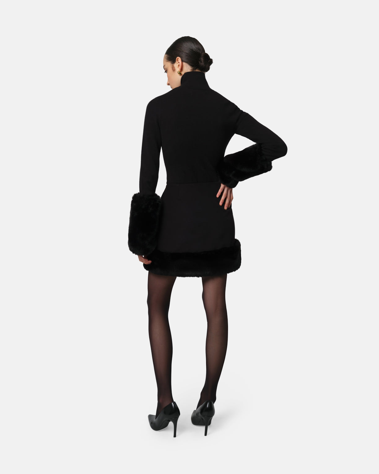 Stretch crepe mid rise mini skirt with recycled extra PLUCHE faux fur trim.