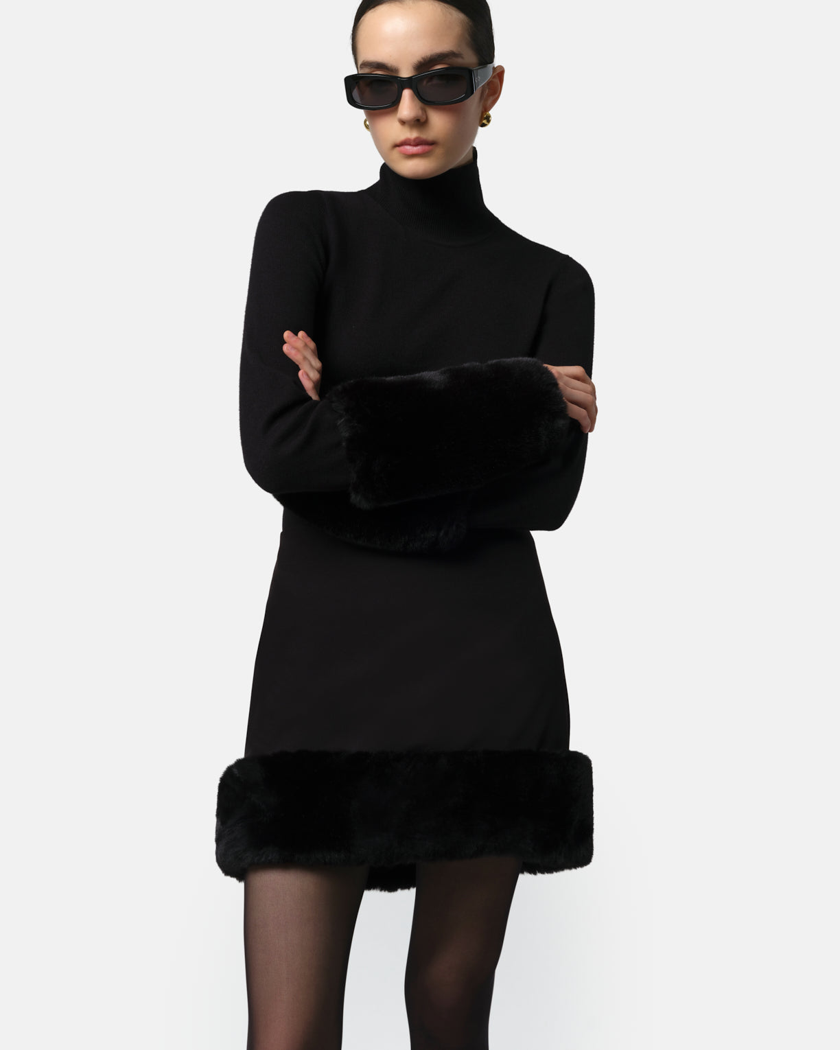 • Stretch crepe with recycled PLUCHE™ faux fur trim.